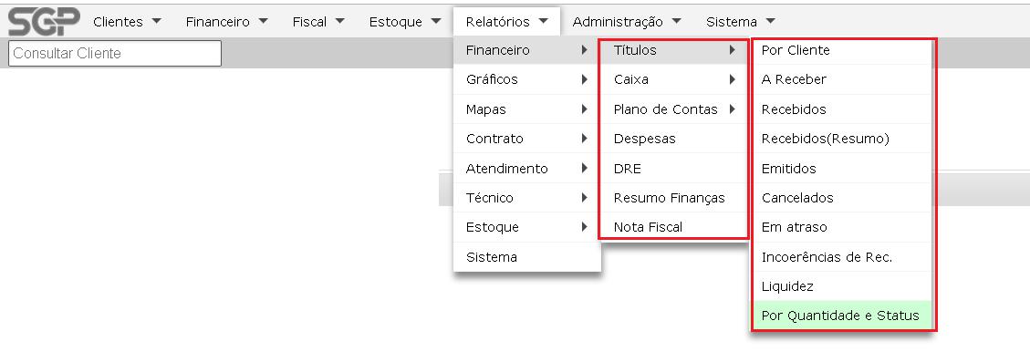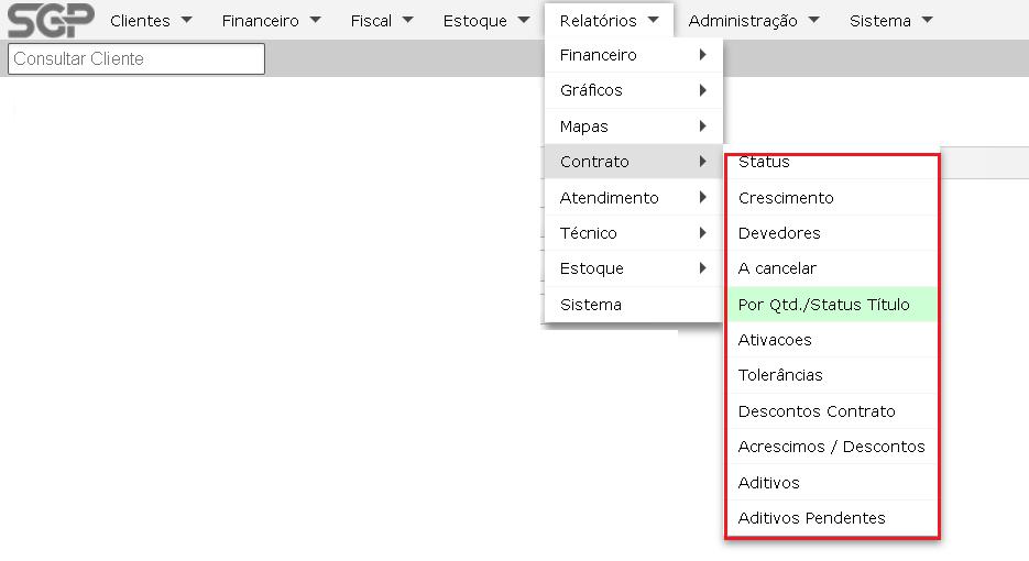 O usuário poderá escolher (parâmetros para consulta) para a geração do relatório como por exemplo: Tipo de Cliente, Pop, Portador, Planos de Contas, Data Inicial e Data Final do Documento, Status do Contrato.