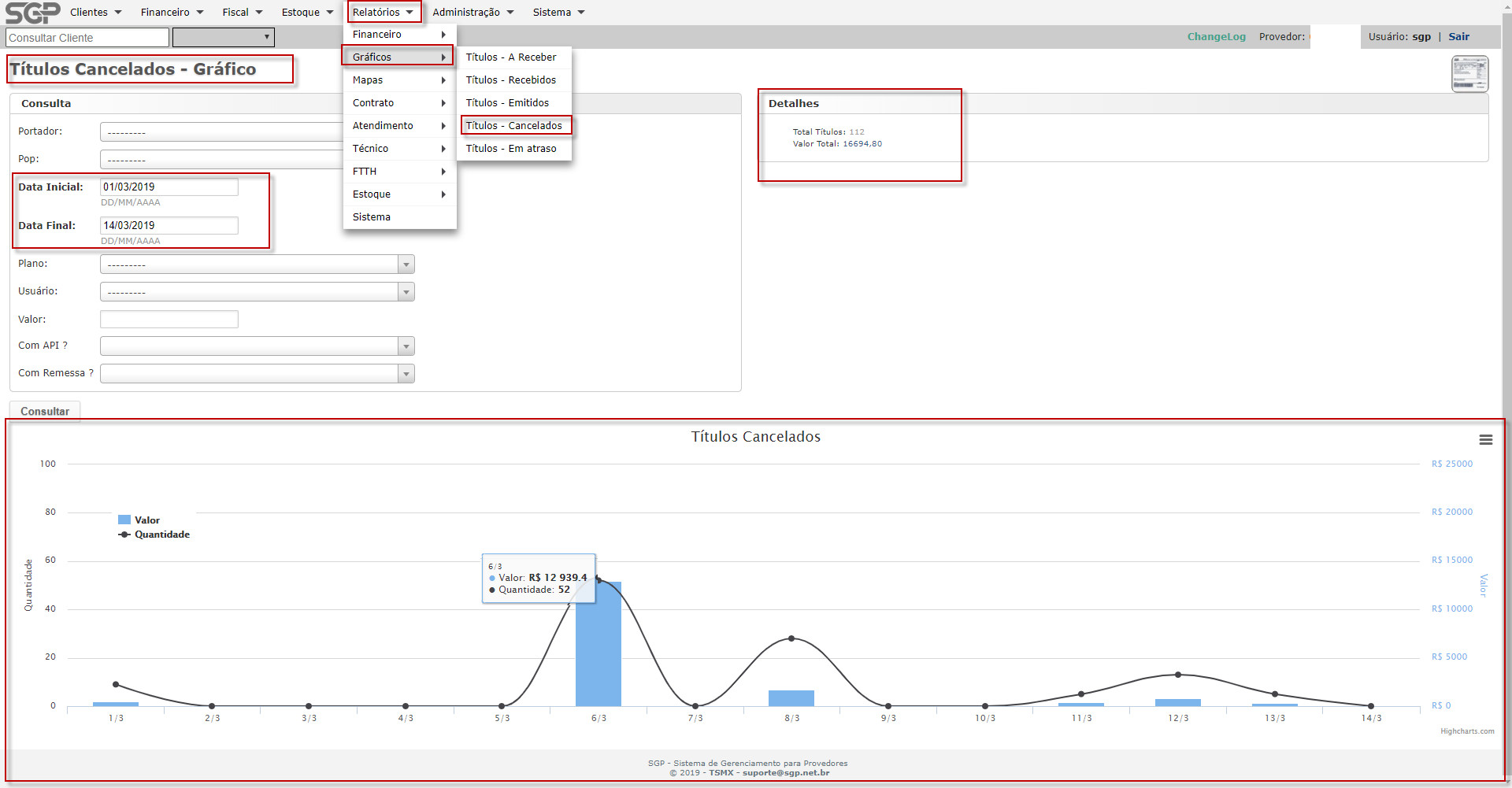 No relatório dos Títulos Cancelados, o sistema apresentará os títulos Cancelados, em forma de Gráfico com Valor e Quantidade dos Títulos Cancelados. O Gráfico mostrará quais serão os dias que apresentaram mais títulos cancelados, com os valores e a quantidade dos títulos.