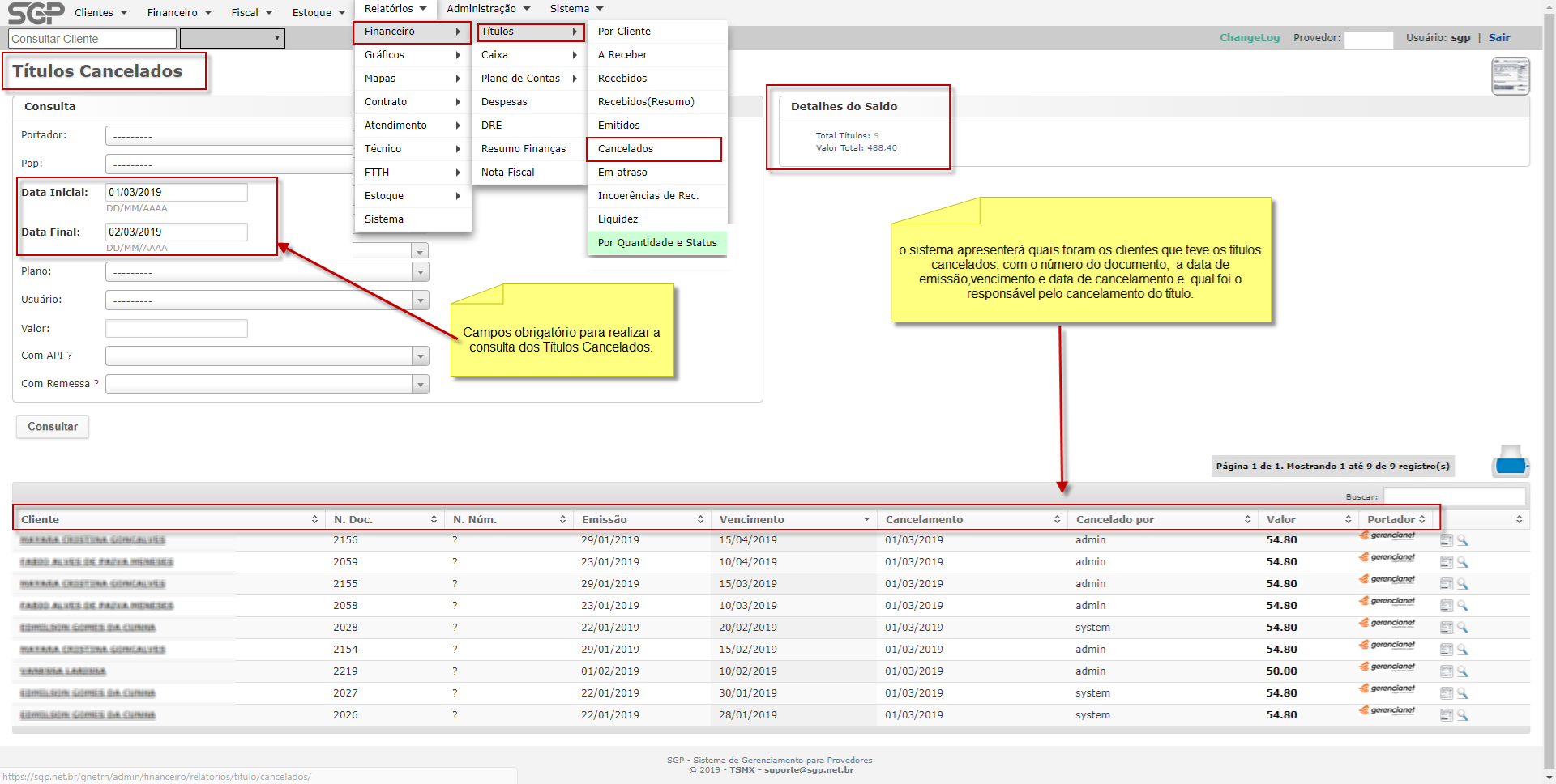 MENU>RELATÓRIOS>FINANCEIRO> TÍTULOS> CANCELADOS
