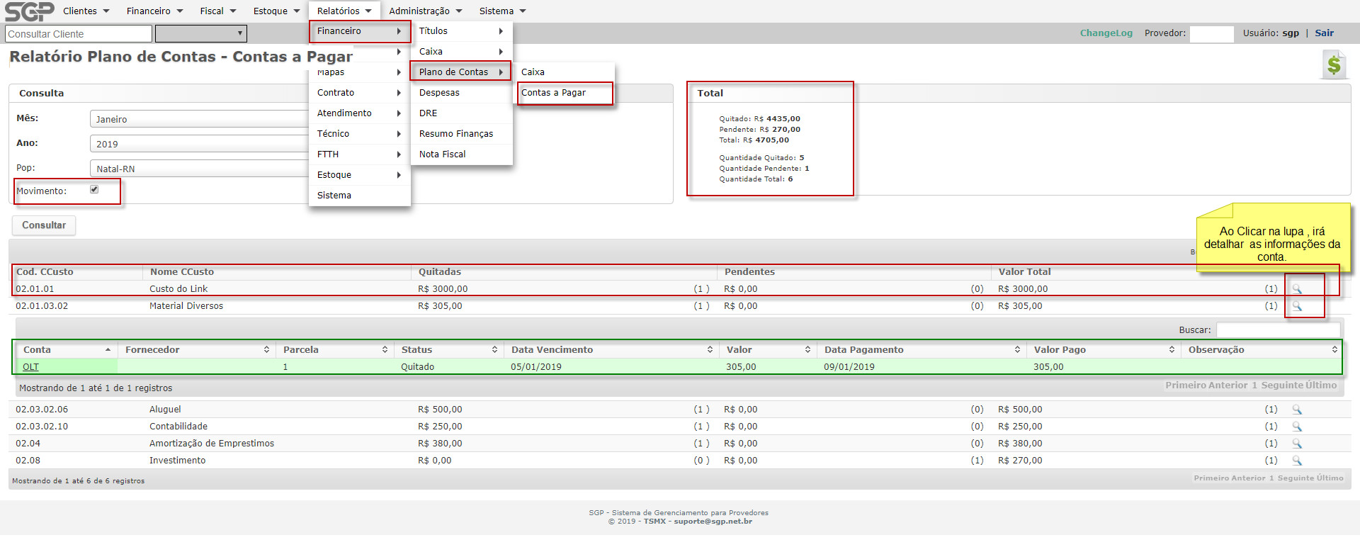 Se clicar na Lupa irá detalhar todo Plano de Conta (Contas a Pagar), o detalhamento apresentará :Conta, Fornecedor, Parcela, Status, Data Vencimento, Valor, Data Pagamento, Valor Pago e Obs.