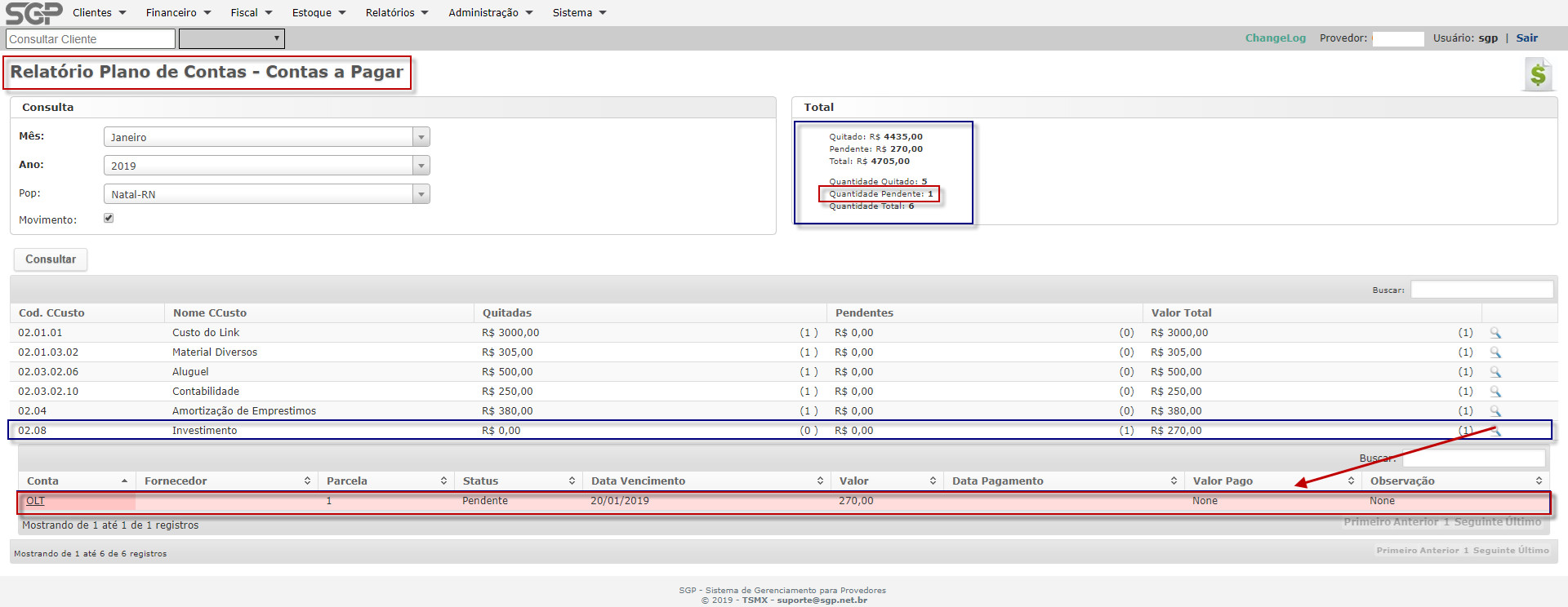 Resultado da Consulta do Relatório Planos de Contas – Contas A Pagar, com o detalhar de uma conta Pendente.