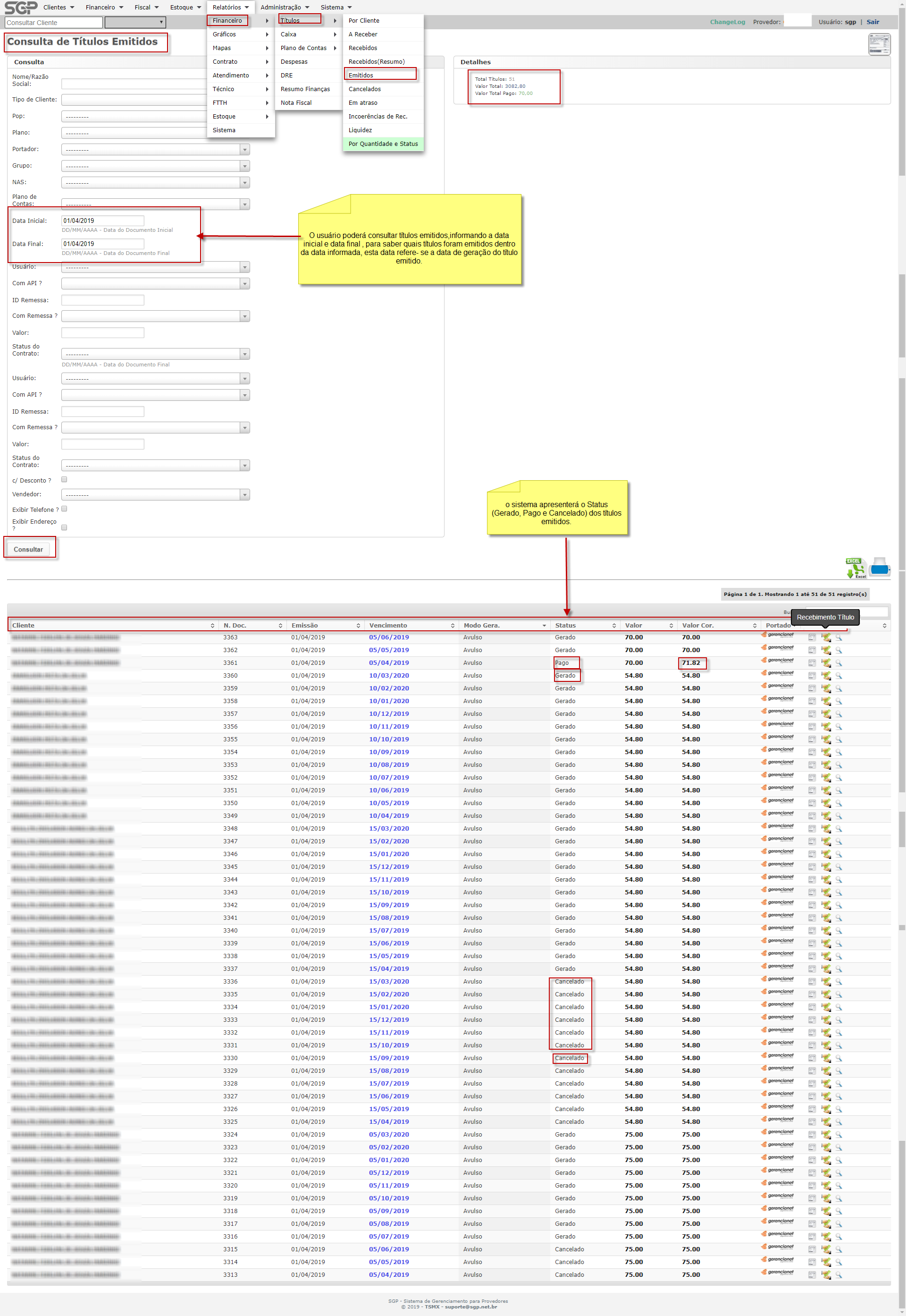 MENU>RELATÓRIOS>FINANCEIRO> TÍTULOS> EMITIDOS