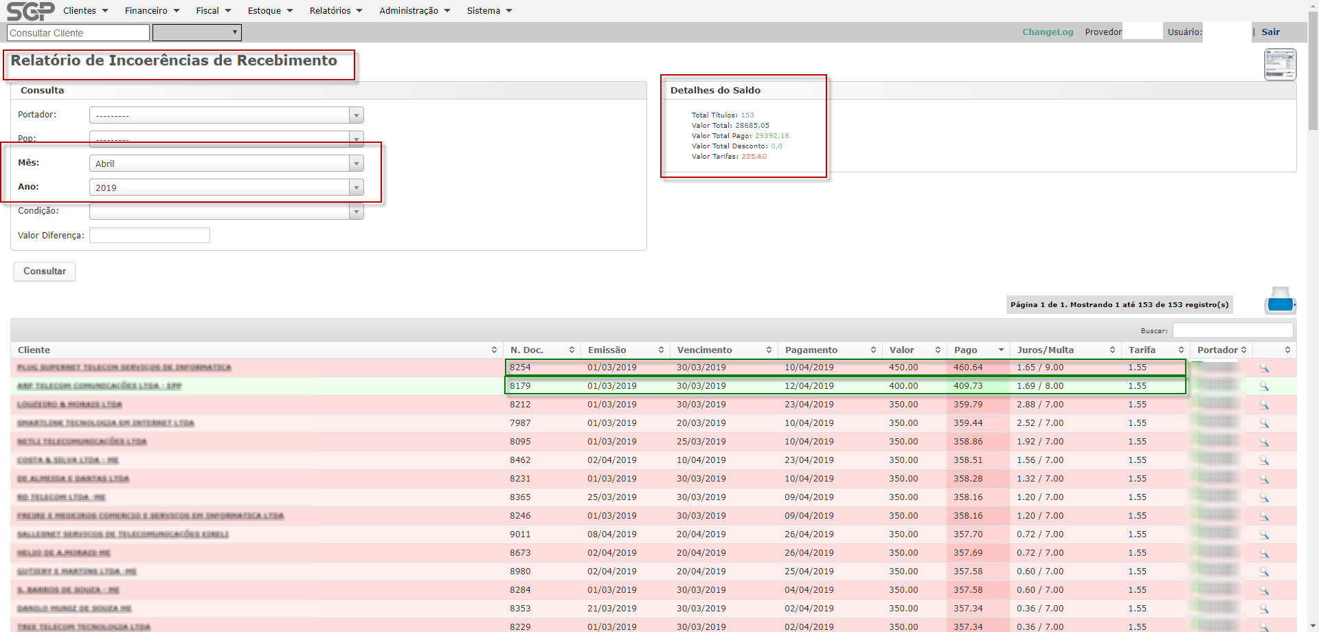 Outro exemplo é o da segunda linha, mostra o pagamento realizado no valor: R$ 409,73 e o valor cobrado(correto) com juros e multas seria: R$ 409,69, veja que o sistema mostra a incoerência de um valor para mais e deixa tachado em verde a linha.
