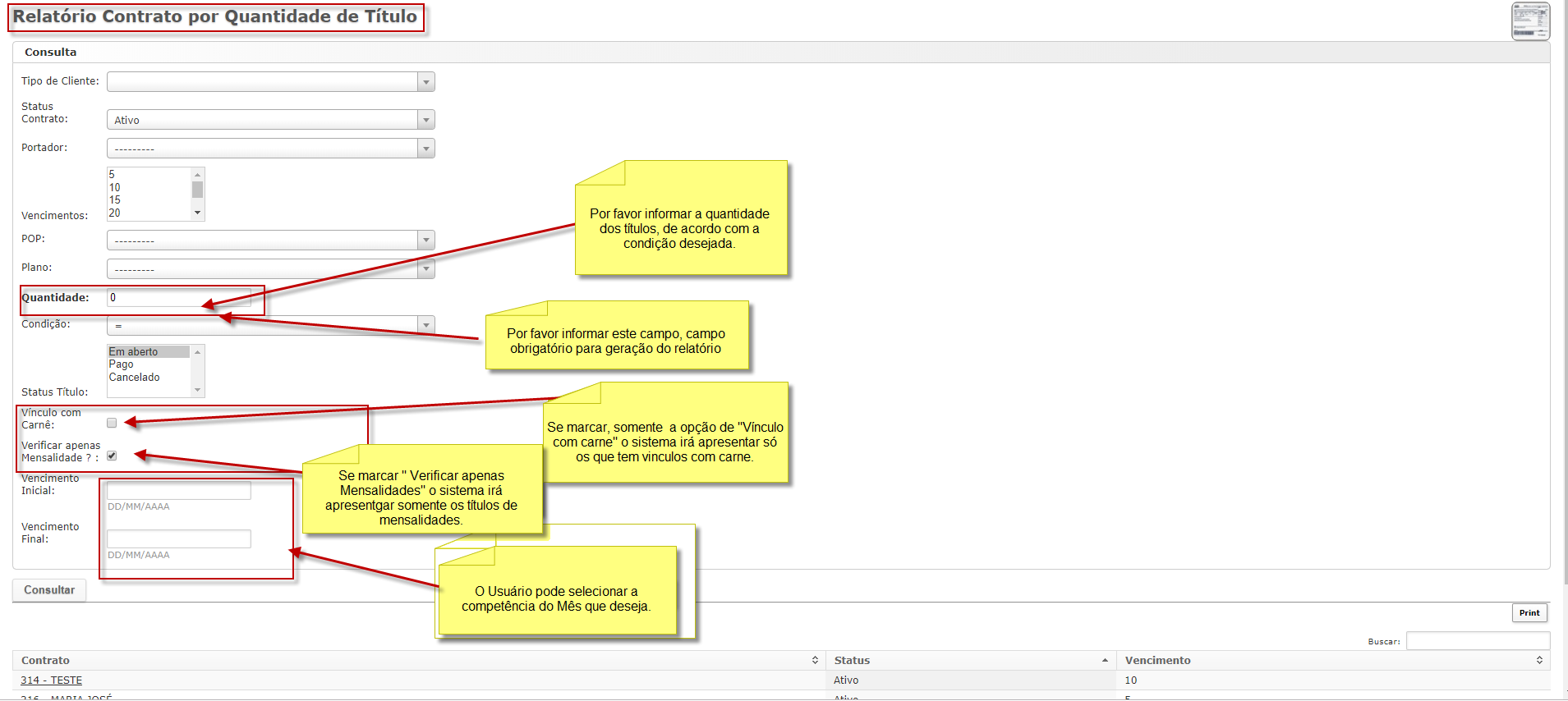 O Relatório Por Quantidade e Status tem a finalidade de apresentar quais são os contratos que não tem títulos, ou os que estejam em aberto, pagos, cancelados, e quais contratos estão próximo de acabar os títulos.