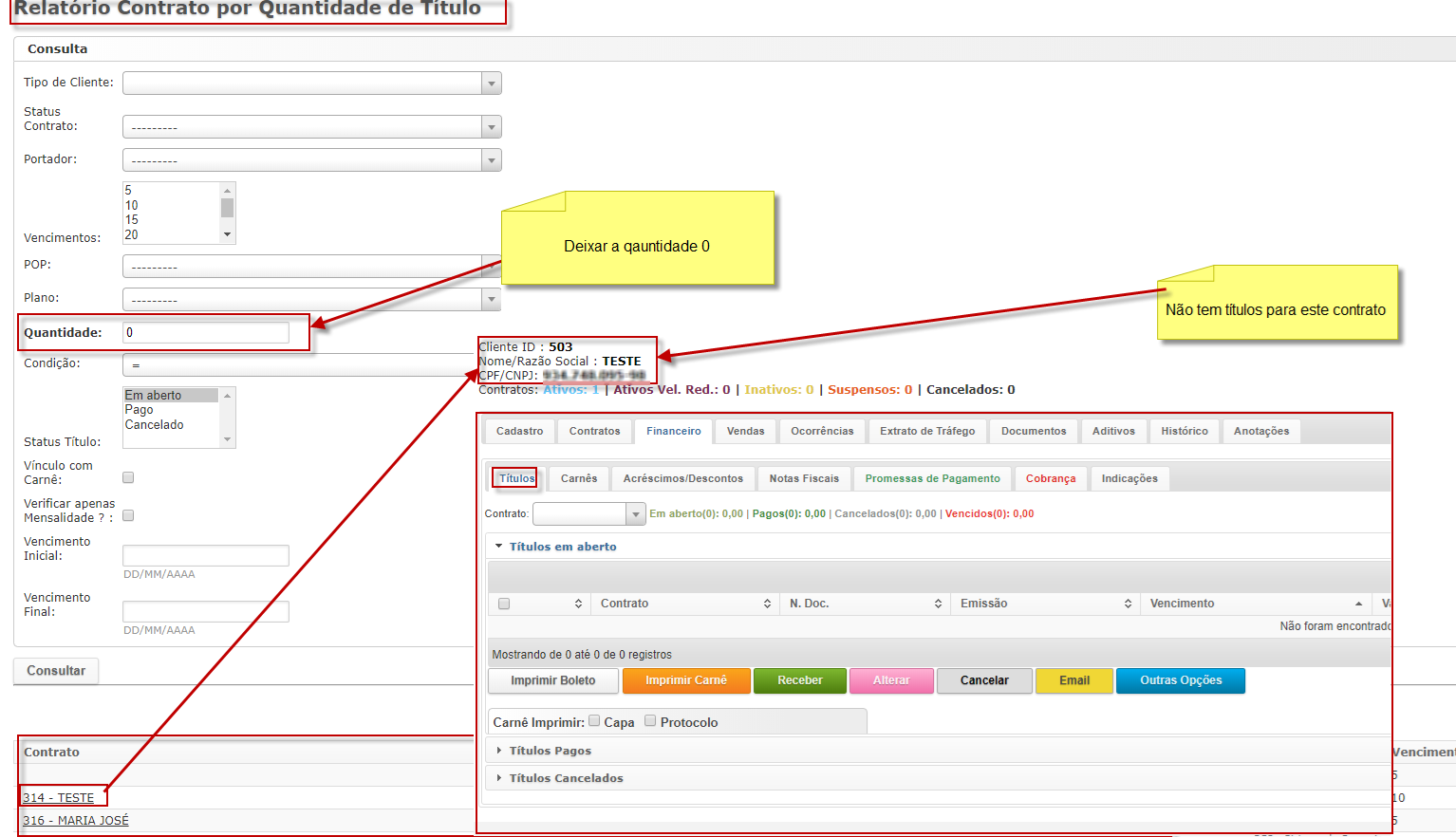 No relatório Contrato Por Quantidade de Títulos e Status, o usuário poderá também gerar um relatório com os contratos que não tem títulos (não existe financeiro) vinculados ao contrato, o usuário só digita 0 na “Quantidade” e clica em consultar.