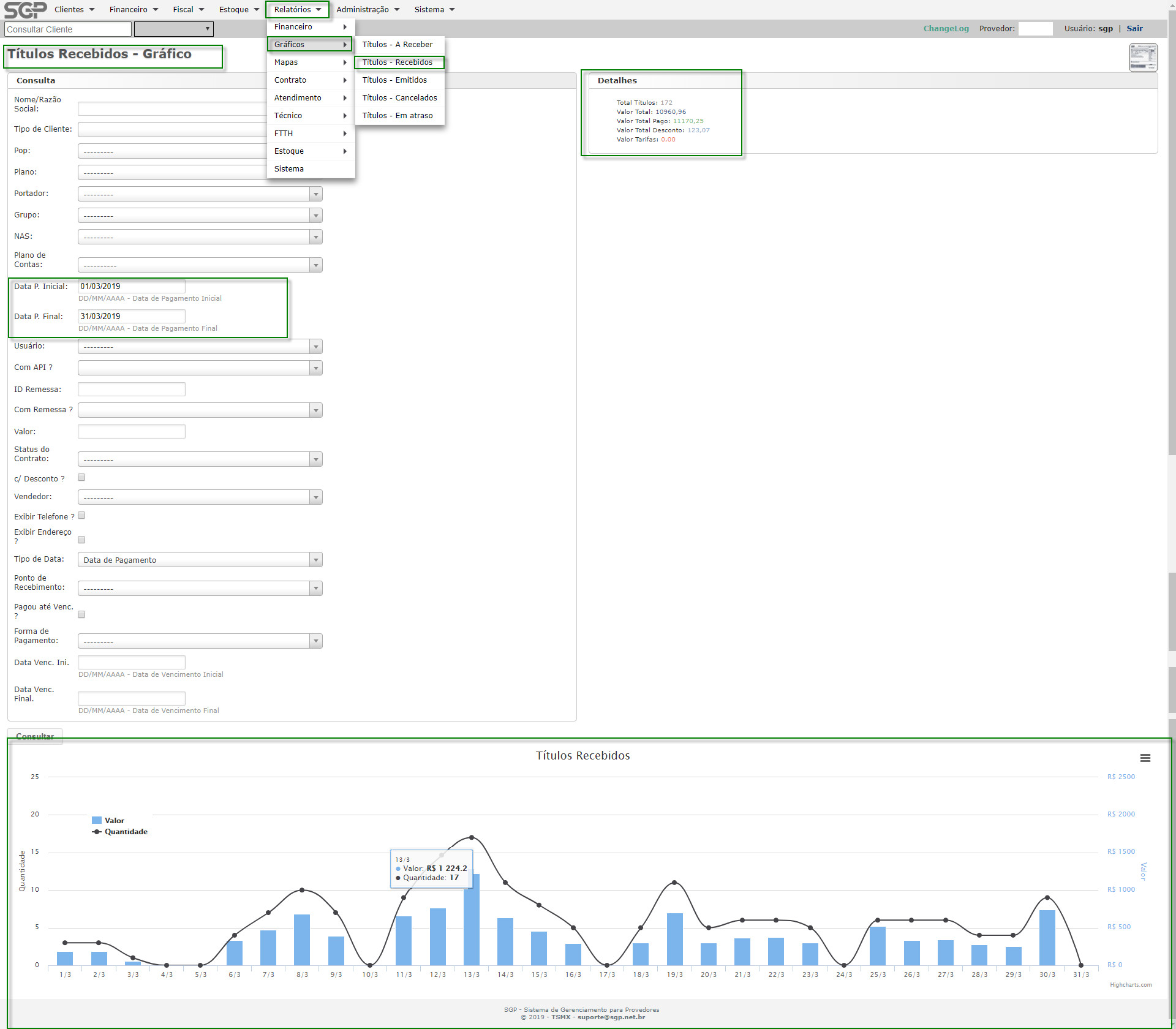MENU>RELATÓRIOS>FINANCEIRO> GRÁFICOS> TÍTULOS RECEBIDOS